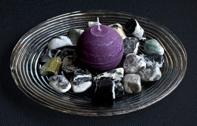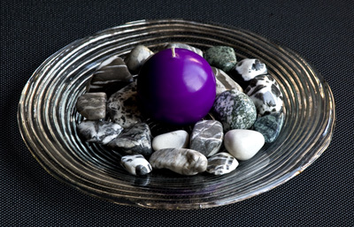 Mittelgrosse Glas-Teller Ø28cm mit 30 "Riverstones" + Kerze