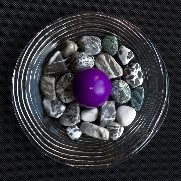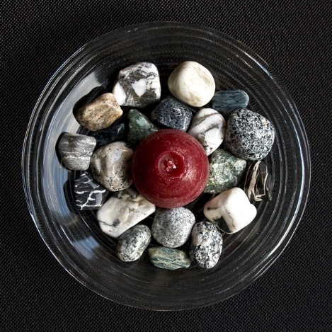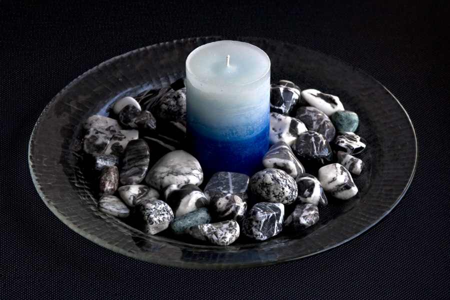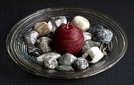 Kleine Glasteller mit 20 polierten "Riverstones" + Kerze